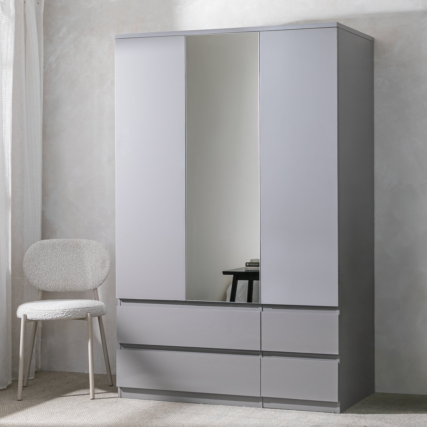 A simple, streamlined design. Our Jenson 3 door mirrored wardrobe has space to store it all. There are 2 hanging rails and 4 drawers that glide smoothly on metal runners. Roomy enough to keep dresses, jackets and trousers pristine and t-shirts neatly folded. Finished in grey gloss the contemporary handleless style brings a smooth modern feel to the bedroom. Smart. . Looking for more? The Argos Home Jenson Collection has matching pieces to complete the look. From bedside tables to whole 4-piece furniture packages, you’ll find everything you need. Made in the UK. . Part of the Jenson collection. . Made of MDF.; 3 doors.; 1 mirror.; 4 drawers with metal runners.; 2 fixed hanging rails.; Hanging rail holds up to 11kg.; Self-assembly – 2 people recommended (includes wall fixings).; If this product is over 60cm high it must be securely attached to the wall to prevent overturning.; Dimensions: Size H184.6, W119.5, D59cm.; Internal hanging space H120, W76.4, D55cm.; Internal drawer H10.6, W54, D52.5cm.; Large internal drawer H10.6, W73.1, D52.5cm.; Weight 88kg.; Package Dimensions: Package 1 dimensions: H124.5, W63, D10.2cm.; Package 1 weight: 36kg.; Package 2 dimensions: H187.5, W58, D11cm.; Package 2 weight: 56kg.; General information: By choosing FSC certified products, you are supporting responsible management of the world’s forests.