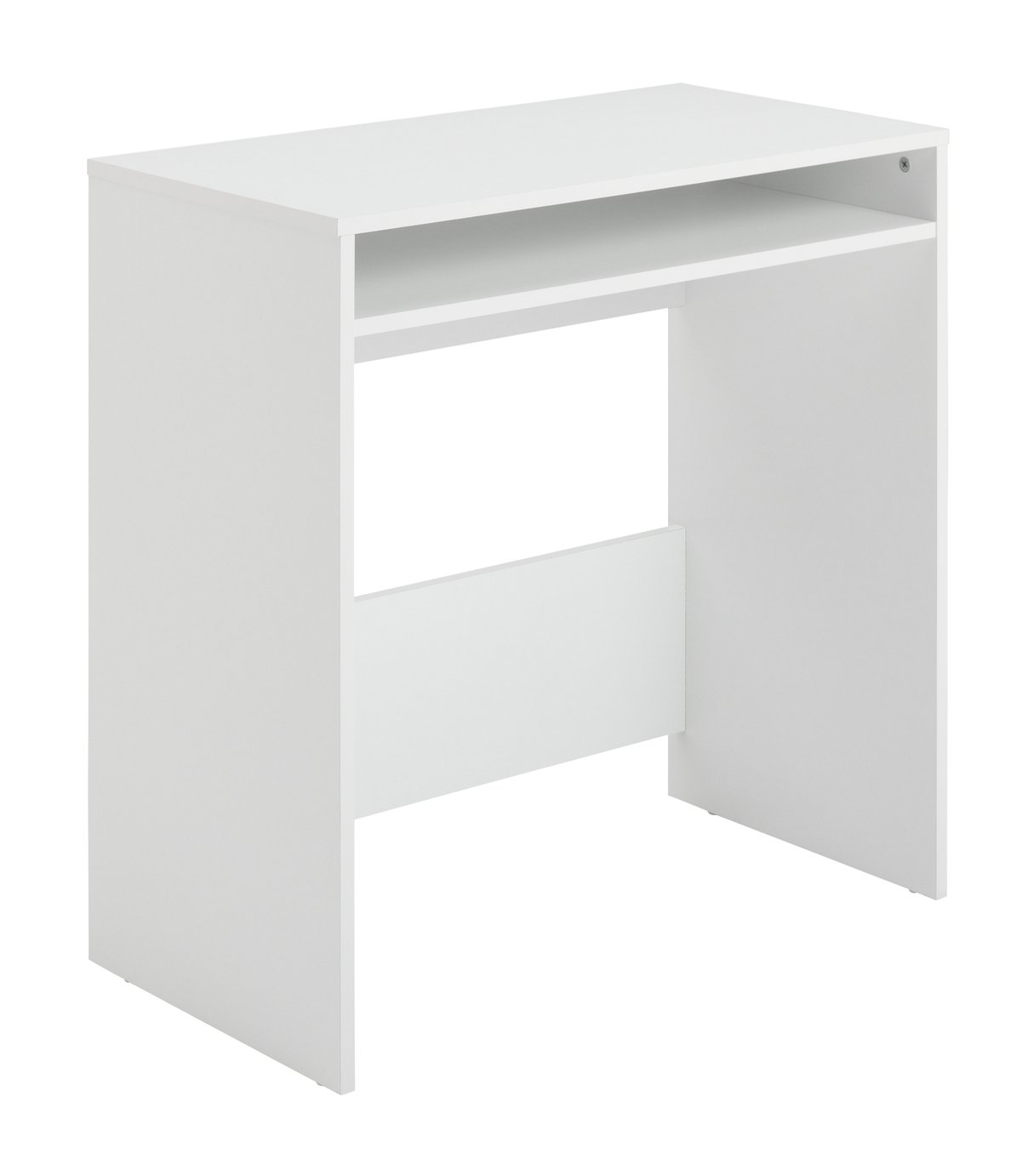 Grab that laptop and pull up a chair, you’ve just found a smart space saving desk. This one’s all about modern minimalism. It has plenty of surface area, and a full width undershelf to rest your keyboard and tuck away stationery. A bright way to work from home. . Put your new piece of office furniture in the spotlight. Check out our range of desk lamps. . Part of the Kenora collection. . Made from wood effect and foil faced chipboard.; 1 fixed shelf.; Keyboard shelf.; Self-assembly – 2 people recommended.; Wall fixing recommended.; If this product is over 60cm high it must be securely attached to the wall to prevent overturning.; General information: Manufacturer’s 1 year guarantee.; Dimensions: Size H76, W74.5, D39.5cm.; Under desk chair space H65.5, W71cm.; Maximum load capacity of desk 25kg.; Weight 14.5kg.; Packaged dimensions: Package dimensions H81.4, W40.7, D10cm.