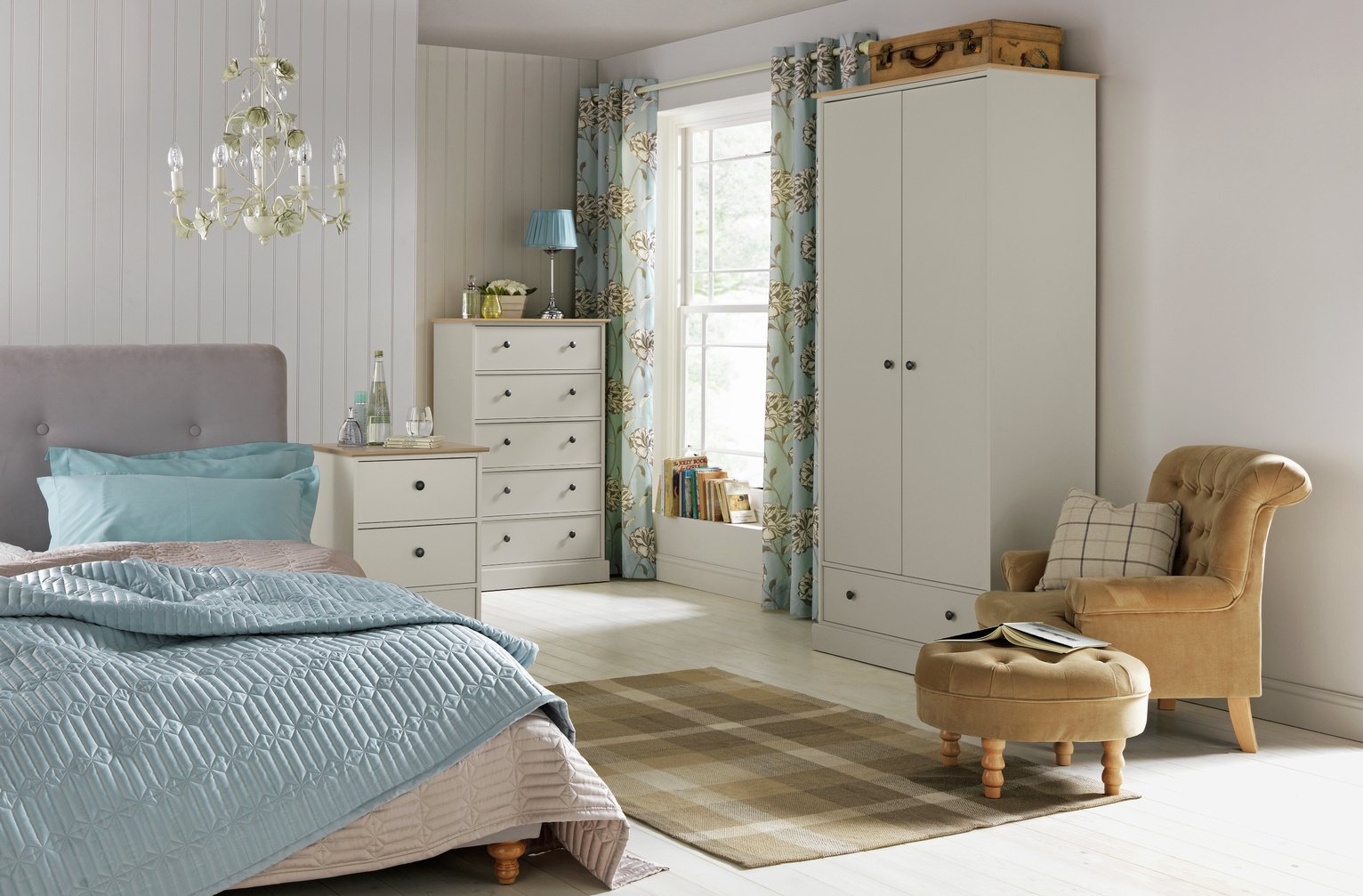 Create a refined, country-style look with the Kensington 2-door 1-drawer wardrobe. Furnished with contrasting metal handles, the wardrobe comes with 1 easy-glide drawer, room for a shoe rack and plenty of hanging space for dresses, suits and more. Made in the UK, the decorative wrap-around plinth and oak effect top give it a traditional, elegant finish. Kensington has all the hallmarks of style and quality. . Part of the Kensington collection. . Made of wood effect.; Metal handles.; 2 doors.; 1 drawer with metal runners.; 1 fixed hanging rail.; Hanging rail holds up to 12kg.; Self-assembly – 2 people recommended.; If this product is over 60cm high it must be securely attached to the wall to prevent overturning.; Dimensions: Size H199, W86, D50cm.; Internal hanging space H158, W79.7, D45cm.; Internal drawer H11, W76.5, D35.6cm.; Handle size: L3, W3cm.; Weight 54kg.; Package Dimensions: Package 1 dimensions: H205, W50, D10cm.; Package 1 weight: 54kg.; General information: By choosing FSC certified products, you are supporting responsible management of the world’s forests.; Manufacturer’s 1 year guarantee.
