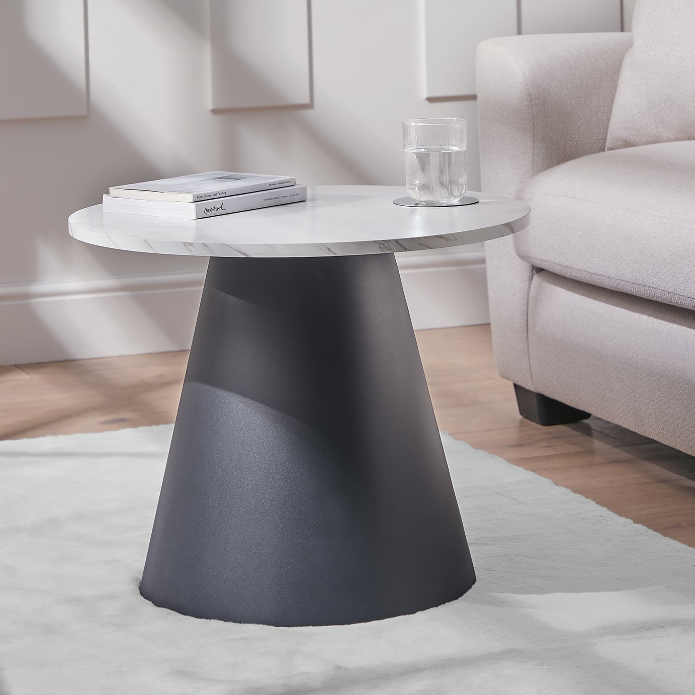 Modern lines. Monochrome style. Lindi’s sleek black frame and marble look top adds a clean, cool edge to your decor. Whether you place it centre stage in the lounge or flanking your favourite chair, it’ll stand out. Just add coffee or cocktails. Congratulations, you just upgraded your living room. . Part of the Lindi collection. . Size H 45.5, W 55, D 55cm.; Diameter 55 cm.; Made from metal and MDF with a marble effect finish.; Weight 5.5kg.; Self-assembly – 1 person recommended.; Maximum load weight 150kg.; Package Dimensions: Package 1 dimensions: H49, W58, D58cm.; Package 1 weight: 8.5kg.; General information: Manufacturer’s 1 year guarantee.