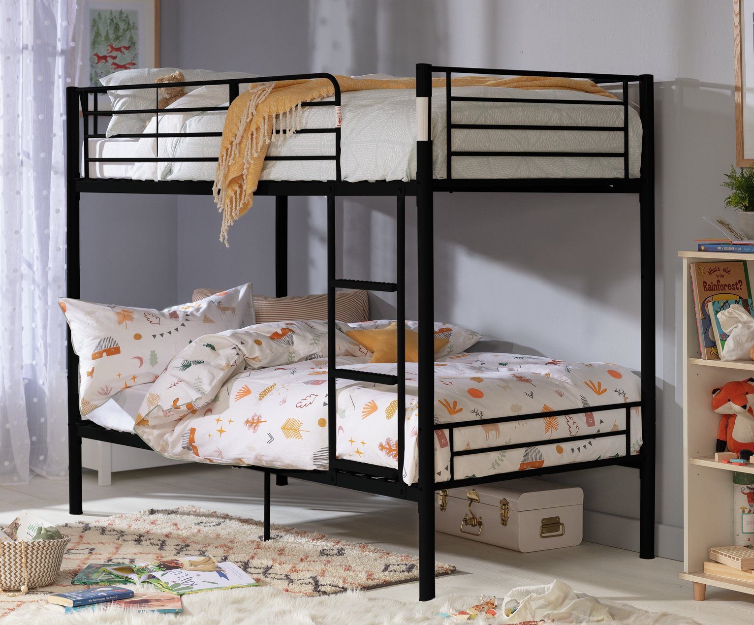 Double up on bed space with the great value Mason bunk bed. Practical and smart, your kids will love climbing into bed with this bunk. Guard rails keep the top sleeper tucked in tight, and the integrated ladder means there are no bits sticking out on the floor. There’s even loads of space underneath for storage. With fixed metal slats, this is a sturdy bed – just add mattresses! . Need mattresses? We know that getting good quality sleep is important for keeping children healthy and happy. So take a look at our range of mattresses to find the best ones for your kids. And if you’re kitting out the whole room, we’ve got loads of great kids furniture for you to choose from. Have a browse and complete the look. . Our products are designed with kids in mind and are built to cope with everyday use. Tested to the latest safety regulations, they comply with British and European safety standards. . Mattresses not included. Part of the Mason collection. . Bunk: Single bed.; Black bed with a metal frame.; Includes metal slats.; Self-assembly – 2 people recommended.; WARNING “This product must be attached to a wall or building structure”.; Ladder can be positioned either side of the bed.; For ages 6 years and over.; Suitable for adult use (safety tested to 100kg).; Mattresses: For safety, maximum depth of mattress to be used on top bunk is 16cm.; Dimensions: Frame size L197, W98.5, H153cm.; Safety rail height 33cm.; Height between bunks 90cm.; Clearance between floor and underside of bed 13cm.; Bed weight 40kg.; Package dimensions: Package 1 size H105.5, W91, D17.5cm.; General Information: Manufacturer’s 1 year guarantee.