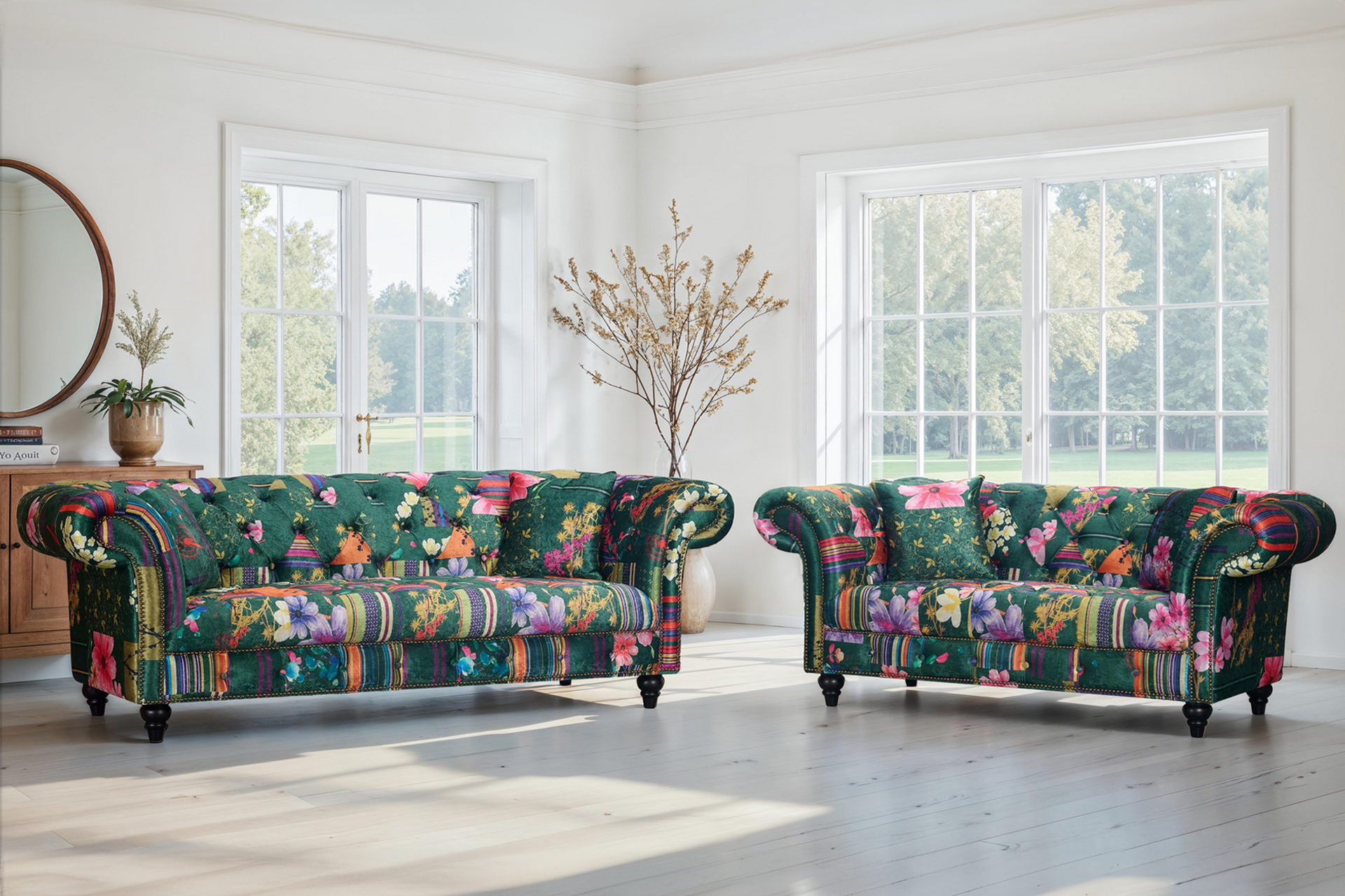 Fabric Green Patchwork 3 + 2 Seater Scroll Arm Chesterfield Sofa Set PORTOFINO