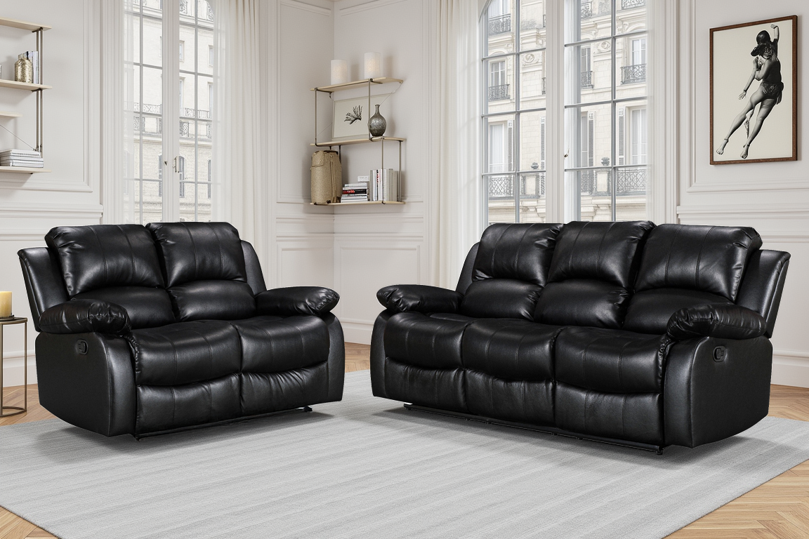 Upgrade your living space with the Faux Leather Black 3+2 Seater Valencia Manual Recliner Sofa Set, a sophisticated and practical addition to any home. This set includes the Faux Leather Black Valencia 3 Seater Recliner Sofa and the Faux Leather Black Valencia 2 Seater Recliner Sofa, providing ample seating for family and guests.