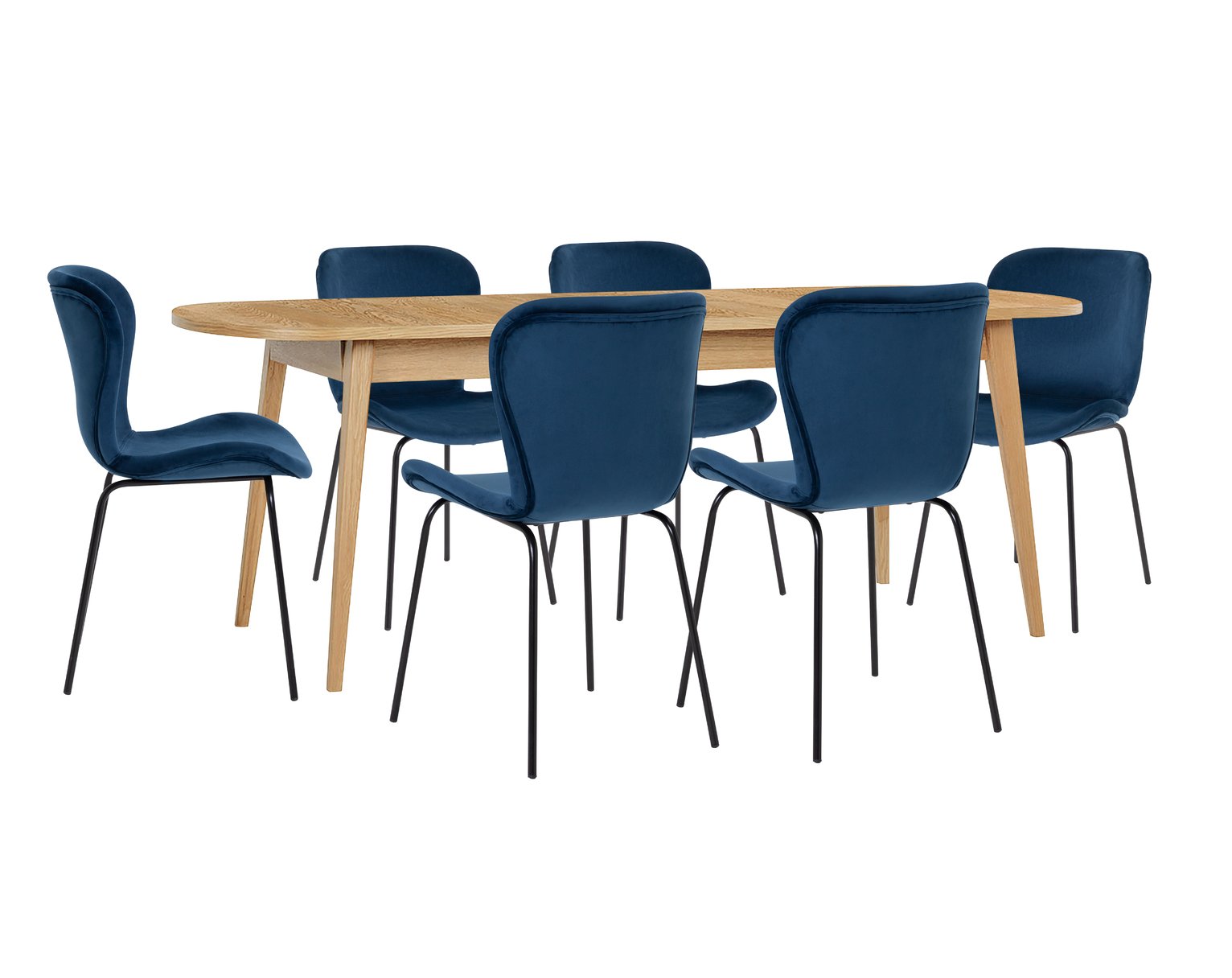 Set the stage with our 6-seater Etta oak table. Big enough to host happy family meals or dinner with friends. Expecting extra guests? Pop the centre leaf extension in place to seat everyone comfortably. Easy. Comes with 6 beautiful chairs covered in smooth navy velvet padding with sleek metal legs. A dash of luxury for your dining area. Super comfy too. A stylish, natural dining set that will play host to your loved ones for years to come. You’re welcome. . Part of the Etta collection. . Product is sold as a set.; Table: Table size H75, W90, L160cm.; Size of table extended L215cm.; Removable table extension piece.; Centre leaf extension type.; Real wood veneer table with real wood veneer legs.; Wood veneer table top finish.; Chair: Includes 6 chairs.; Size of each chair H82.5, W48, D56cm.; Seat height 47cm.; Fabric frame with metal legs.; Fabric seat pad.; Maximum user weight per chair 110kg.; Individual chair weight 4.45kg.; Package Dimensions: Table package 1 size H14, W169, D96cm.; Individual chair package size H52, W67, D49cm.; General information: Self-assembly – 2 people recommended.; Manufacturer’s 1 year guarantee.; Wipe clean with a soft cloth.