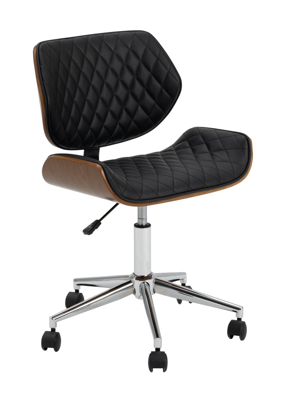 Get yourself comfortable and get down to work. Our striking swivel chair is designed to be supportive. Upholstered in black PU leather, it has a quilted finish and a contemporary curved seat. . With wheeled castors and an adjustable height, this modern office chair is built to suit you in every way. . Metal frame with faux leather seatpad and faux leather backrest.; Swivel .; Mounted on castors for easy mobility.; Self-assembly.; Dimensions: Overall maximum chair size H76.5, W54, D64cm.; Seat height adjustable from 45 to 57cm.; Seat height 45cm.; Seat size W53, D37cm.; Maximum user weight tested for 110kg.; Weight 10.4kg.; Packaged dimensions: Package size H34, W58, D56cm.; General information: By choosing FSC certified products, you are supporting responsible management of the world’s forests.; Manufacturer’s 1 year guarantee.