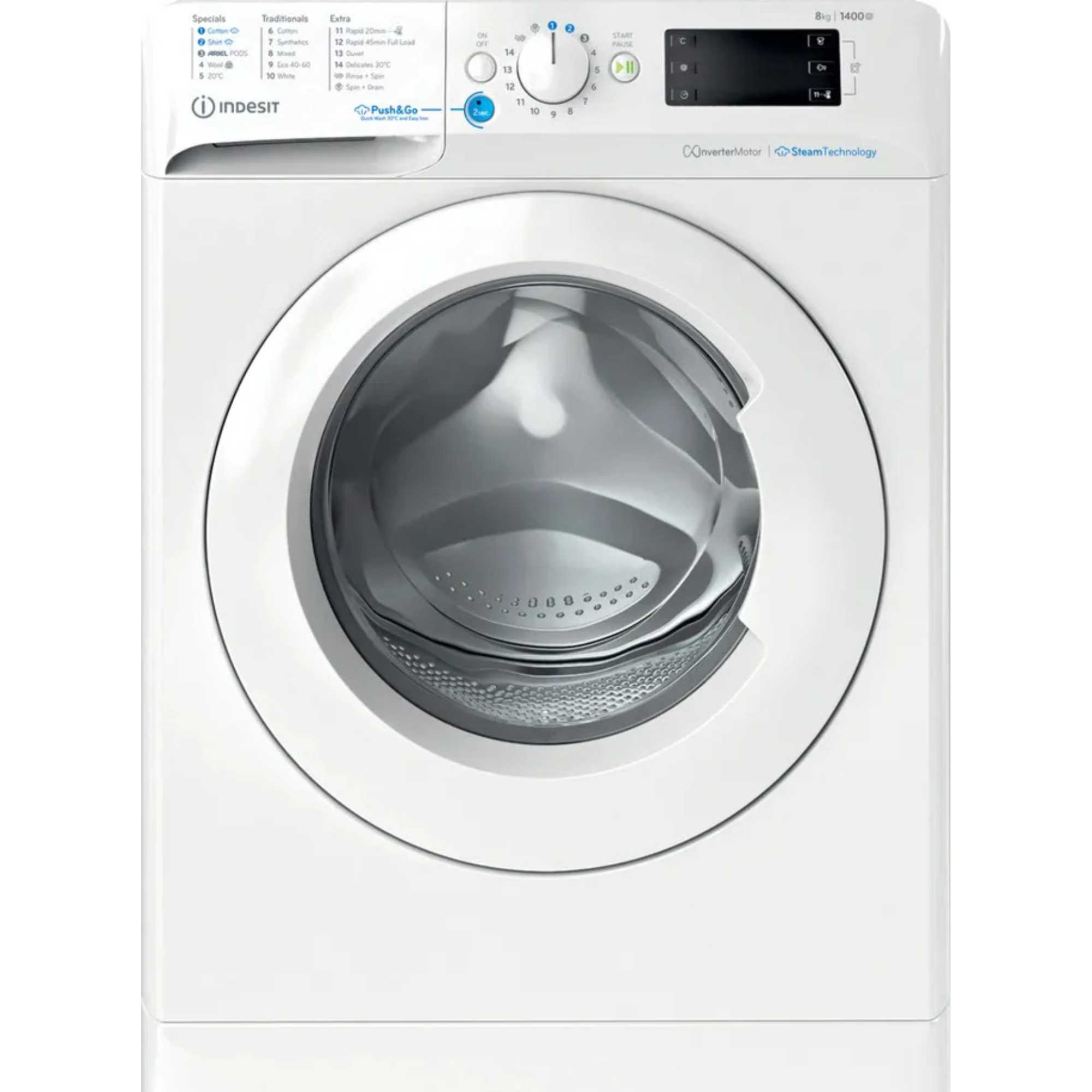 8kg Drum Capacity Push&Go with Steam Technology Inverter Motor Delay Start Keylock Feature Product Description The Indesit BWE 81496X 1400rpm 8kg Washing Machine is a powerful, efficient, and user-friendly appliance designed to simplify your laundry routine. With an 8kg drum capacity, this washing machine is perfect for medium to large households, allowing you to wash more clothes in fewer loads so saving you time. Whether it is daily laundry or larger items like bedding, the spacious drum ensures that every wash is handled with care and precision. One of the key features of this washing machine is the innovative Push&Go with Steam Technology, designed to make laundry easy for everyone. With just a single button press, you can activate a programme that removes stains in just 45 minutes without the need for pre-treatment. The added steam option enhances this process by deeply penetrating fabrics, reducing wrinkles and refreshing your clothes for easy ironing. The Inverter Motor ensures that the washing machine operates efficiently and quietly, providing excellent performance with reduced noise and vibration. Safety and convenience are prioritised with the Keylock feature, preventing accidental changes to settings during a wash cycle, especially useful in households with children. Combining ease of use and advanced technology, the Indesit BWE 81496X Washing Machine is the perfect addition to any modern home, delivering clean and fresh laundry every time.