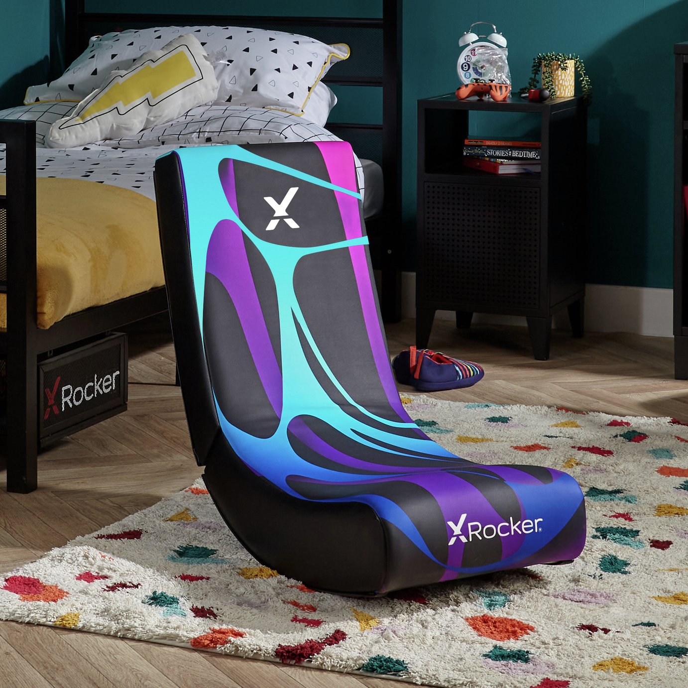 Meet the X Rocker Galaxy Video Rocker, the gaming chair for kids that is out of this world! With its low-profile shape and rocking base, the Galaxy rocker is ideal for ensuring safe and comfortable floor-level seating. Yet versatile whilst also durable and easy to clean, the Galaxy Video Rocker is the ultimate seat for fun and relaxation. When you’re done, simply fold it away for easy storage ready for the next session. The chair where comfort rocks! . Gaming Chair for Juniors – Built into a compact and folding frame, making this a great entry level gaming chair for younger players and smaller bedrooms. . Long Play Comfort – Game for hours thanks to a generous foam padded interior and rich faux leather material for soft and durable support. X Rocker have recently undergone an exciting rebrand. As such your product may have a different brand logo style to what is pictured. . Just Unfold and Play! Easy to assemble, this gaming chair folds down for storage when not in play. . PS4 compatible.; PS5 compatible.; Xbox one compatible.; Xbox series X and S compatible.; PC compatible.; Nintendo switch compatible.; Nintendo switch OLED compatible.; Size H62, W36, D76cm.; Weight 7.2kg.; Includes 1x Video Rocker.; Package Dimensions: Comes in 1 package(s).; Package 1 dimensions: H32.5, W39, D57cm.; Package 1 weight:9kg.; General information: Manufacturer’s 1 year guarantee.; For ages 4 years and over.; EAN: 0094338240597.